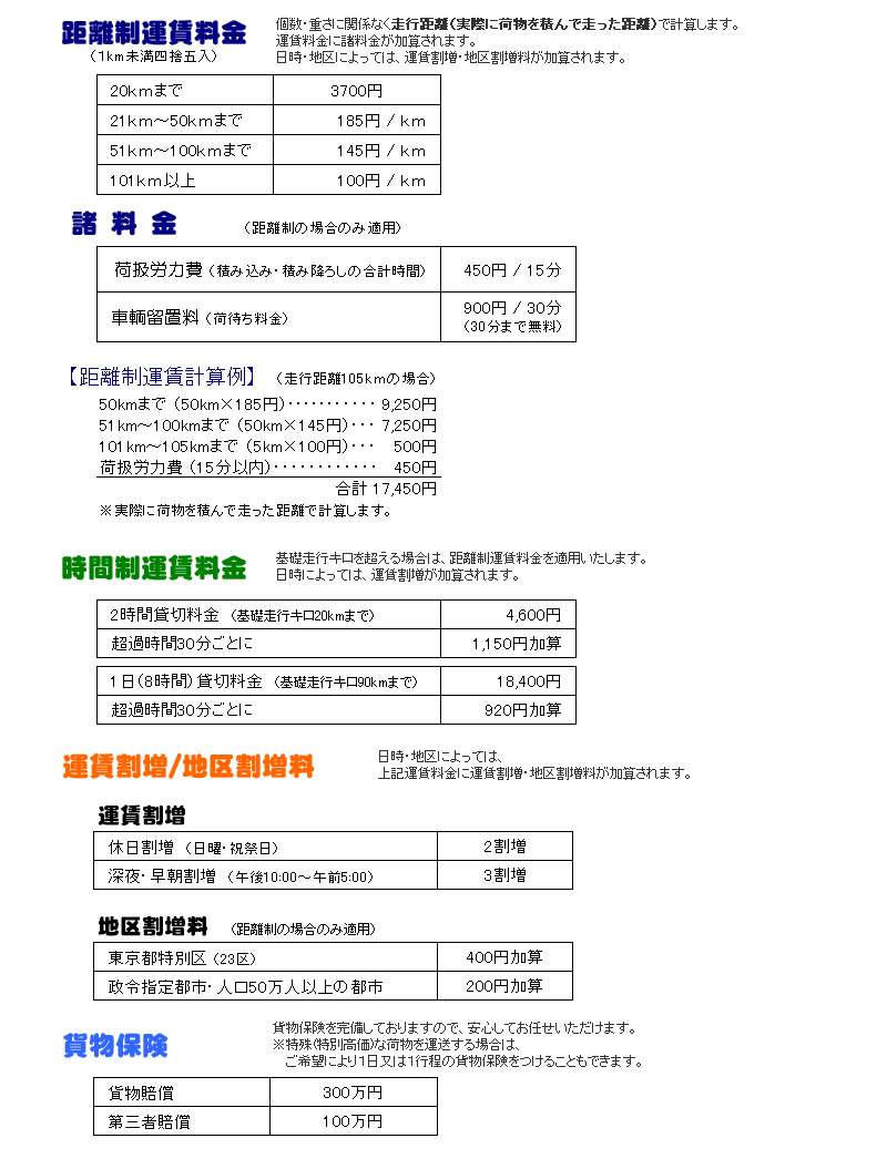 | ※距離制運賃と時間制運賃の適用については、仕事の内容により、担当ドライバーが判断させていただきます。 ※運賃料金にはすべて消費税が含まれています。 |